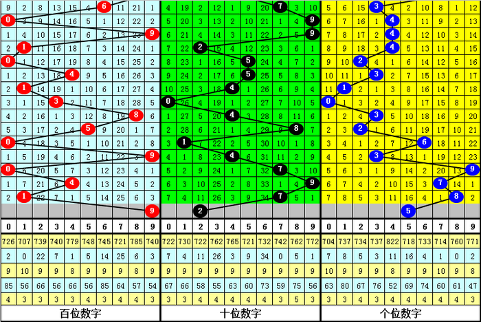 第一位前三次开出奖号1之后,下期落号为:9-0-3,开出在:热码区段、冷码区段、冷码区段,本期第一位看好出现在热码区段,注意冷码继续走冷轮空。